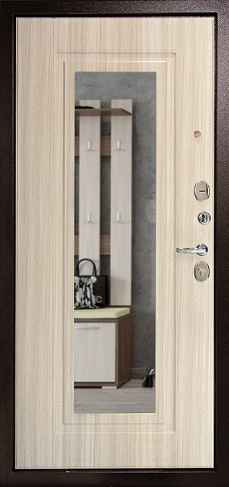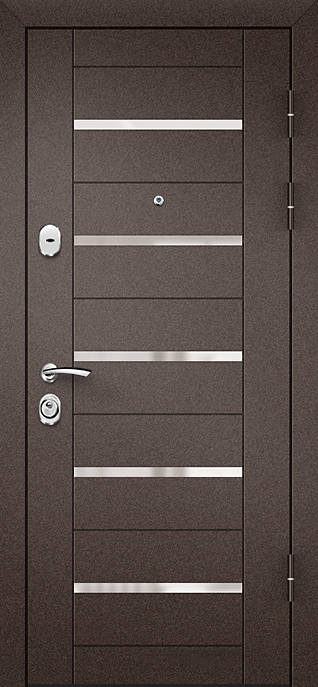 Прочный стальной каркас, лист металла толщиной 2 мм и система блокираторов делают эту модель надежным барьером для квартиры, офиса или частного дома. Внешняя поверхность покрыта молотковым напылением, устойчивым к механическим повреждениям и перепадам температуры, благодаря чему дверь сохраняет аккуратный вид долгие годы. Внутренняя накладка МДФ добавляет уюта и гармонично сочетается с интерьером прихожей. Зеркало на полотне выполняет не только декоративную функцию, но и делает пространство визуально шире. Зеленая входная дверь в квартиру №2 комплектуется двумя замками российских производителей — сувальдным Просам и цилиндровым Мосрентген, каждый из которых оснащён тремя ригелями. Два контура резинового уплотнения помогают минимизировать сквозняки и шум, а возможность выбрать сторону и тип открывания делает установку максимально удобной. При необходимости отделку, замки и дополнительные элементы можно адаптировать под индивидуальные требования. Зеленая входная дверь в квартиру №2 от производителя: быстрое изготовление и монтаж в Наро-Фоминске, индивидуальные размеры, широкий выбор материалов и фурнитуры, официальная гарантия до 10 лет.