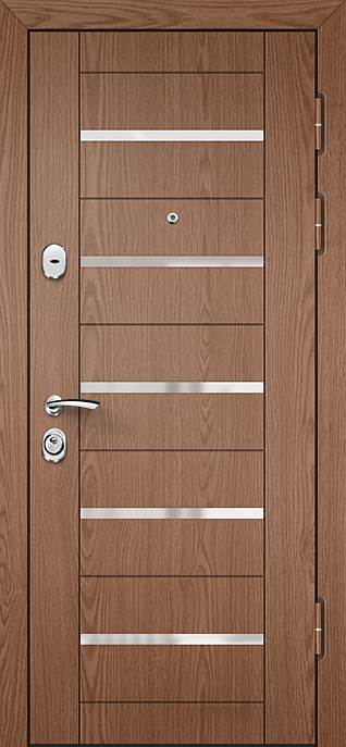 Входная дверь с зеркальным полотном №53 выделяется тем, что зеркало занимает почти всю внутреннюю поверхность, превращая дверь не просто в защитный элемент, а в полноценную часть интерьера. Такое решение особенно удобно для квартир и офисов, где зеркало необходимо ежедневно, а отдельное место для него найти непросто. Каркас изготовлен из профильной трубы и усилен рёбрами жёсткости, стальной лист толщиной 2 мм обеспечивает прочность и устойчивость к нагрузкам. В отделке использованы панели МДФ с ПВХ-покрытием, которые стойко переносят повседневные испытания и сохраняют внешний вид долгие годы. Два контура уплотнения защищают от сквозняков и уличного шума, а возможность выбрать размеры и направление открывания позволяет адаптировать модель для частных домов и городских квартир. Входная дверь с зеркальным полотном №53 от производителя: быстрое изготовление и монтаж в Наро-Фоминске, индивидуальные размеры, широкий выбор материалов и фурнитуры, официальная гарантия до 10 лет.