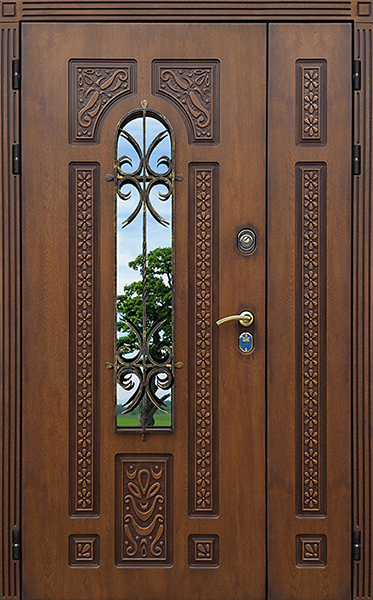 Двойная входная дверь с большим стеклом и ковкой для дома №25 сочетает в себе стиль и надежность, предлагая великолепное решение для вашего дома. Внешняя и внутренняя отделка выполнены из панелей МДФ с ПВХ, что придает двери долговечность и устойчивость к механическим повреждениям, а также способствует легкости ухода. Стеклопакет в комбинации с изысканным кованым узором создаёт не только эстетическое наслаждение, но и позволяет улучшить светопроникновение в помещении. Двойная входная дверь с большим стеклом и ковкой для дома №25 от производителя: быстрое изготовление и монтаж в Наро-Фоминске, индивидуальные размеры, широкий выбор материалов и фурнитуры, официальная гарантия до 10 лет.